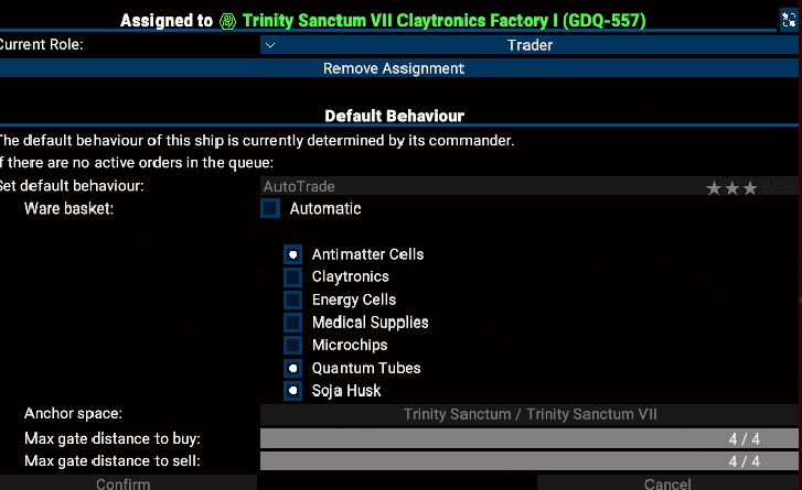 In Version 7.00 gibt es eine neue Funktion, mit der Benutzer bestimmte Waren für den Handel mit einem untergeordneten Schiff auswählen können. Bisher wurden beim Hinzufügen eines Untergebenen zu einem Kommandanten die gehandelten Waren automatisch ausgewählt. Jetzt können die Spieler das Verhaltensmenü des Schiffes aufrufen und die zu handelnden Waren manuell auswählen, nachdem sie zuvor die Option „Automatisch“ deaktiviert haben. Auf diese Weise können Spieler alle Waren ausschließen, mit denen das Schiff nicht handeln soll, wobei mindestens eine Ware ausgewählt werden muss. Wenn mehrere Waren ausgewählt werden, sucht das Schiff auf der Grundlage dieser Auswahl nach Handelsgütern, wobei Waren, die die Station als kritisch einstuft, Vorrang haben.