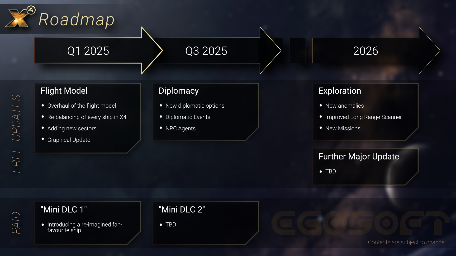 Allerdings sind wir jetzt an einem Punkt angelangt, an dem wir glauben, dass wir euch ein Bild davon vermitteln können, was für X4 im Jahr 2025 ansteht. Deshalb freuen wir uns, euch heute eine allgemeine Roadmap vorzustellen, die Einblick in unsere Richtung gibt und euch eine Idee davon gibt, worauf ihr euch freuen könnt.